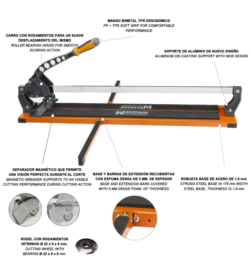 - Gracias a sus barras de extensión de 330 mm. puede ampliar su base hasta los 830 mm. de ancho ideal para baldosas grandes.