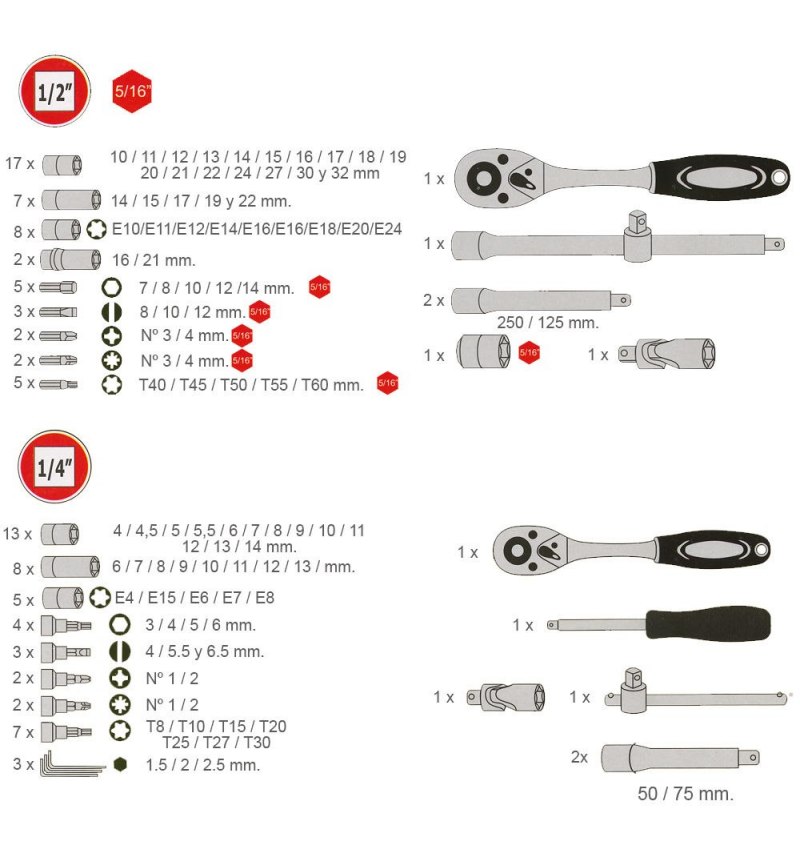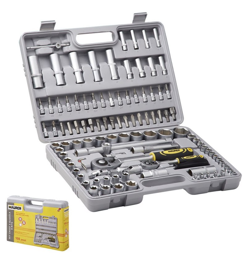 Maletin completo con todos los accesorios que reduce la pérdida de piezas, permitiendo una identificación rápida de las mismas y de las que faltan.
