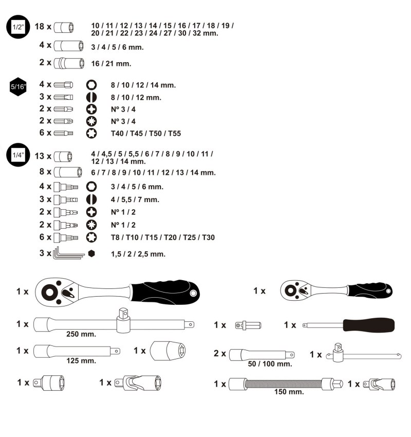 - Incluyendo llaves de carraca, llaves de vaso, adaptadores, alargadores y puntas.