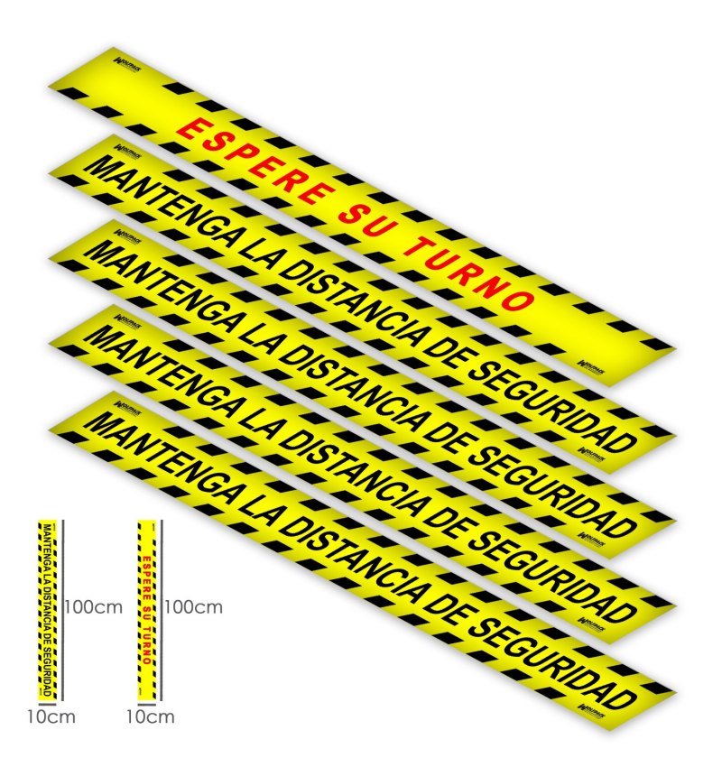 - Kit de 5 pegatinas de rotulación de suelo. Incluye 4 pegatinas con la advertencia: Mantenga la distancia de seguridad, ademas de una pegatina de Espere su turno.