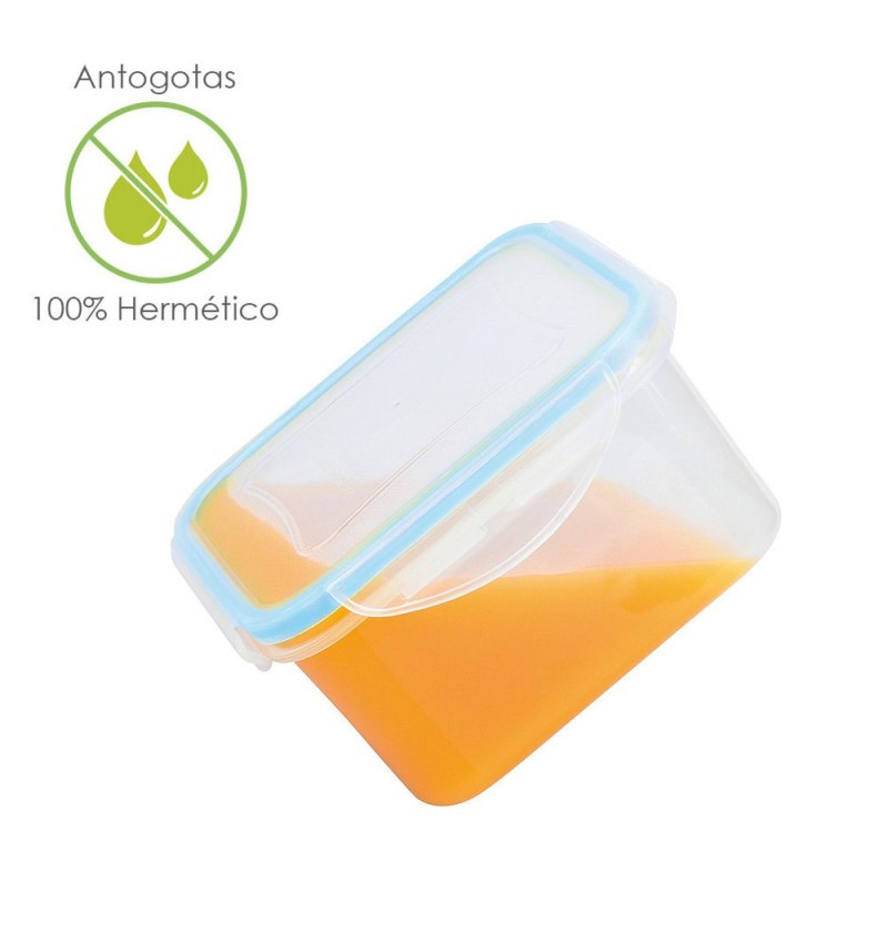 - Recipientes herméticos para una mejor conservación y un transporte sin derrames. Las tapas cuentan con un sistema de 4 cierres de bloqueo además están realizadas en silicona inyectada que se adhiere al recipiente aislando los alimentos de gérmenes y olores externos y favoreciendo su perfecta conservación.